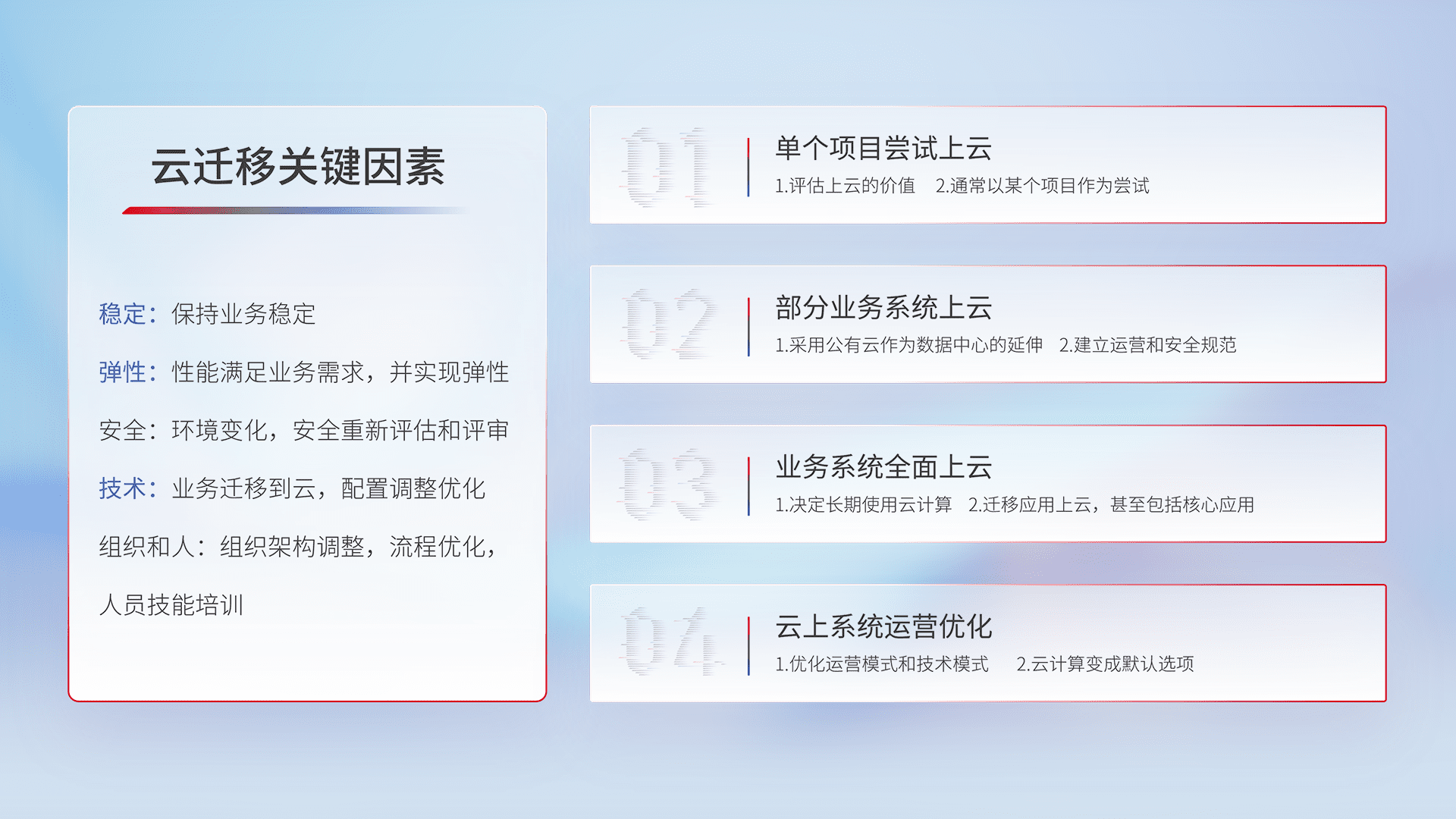结合实际业务,,,从规划设计、、、、云平台选型、、、云原生改造、、、数据迁移、、、集成交付,,迁移全过程为客户识别最佳上云路径,,做好风险识别管理,,设计网络架构、、、身份权限、、、、安全审计合规、、、操作审计、、、日志审计、、、、监控告警策略、、多站点容灾设计等,,,,对云上基础设施进行整体规划,,提升IT治理水平,,,,以满足弹性、、高可用、、、、高性能的需求。。。。