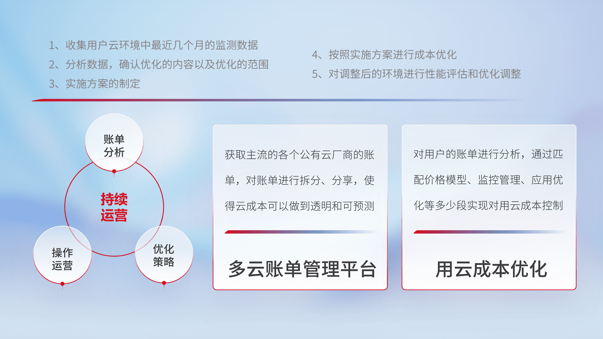 通过灵活运用多种自动化迁移工具,,帮助企业用户实现业务和数据高效 、、、稳定的上云迁移和云上迁移,,,采用自研多云纳管平台,,,以中立管理模式,,解决多组织、、、、多云、、多运维厂商的复杂关系的管理,,,,保证多云平台资源配置的一致性,,,实时掌控云资源运行数据,,,,运用智能化工具分析云资源多云平台的管理服务,,,透明化管理成本支出,,,,用云成本可预测、、用云费用可优化、、云资源配额有据可依。。。