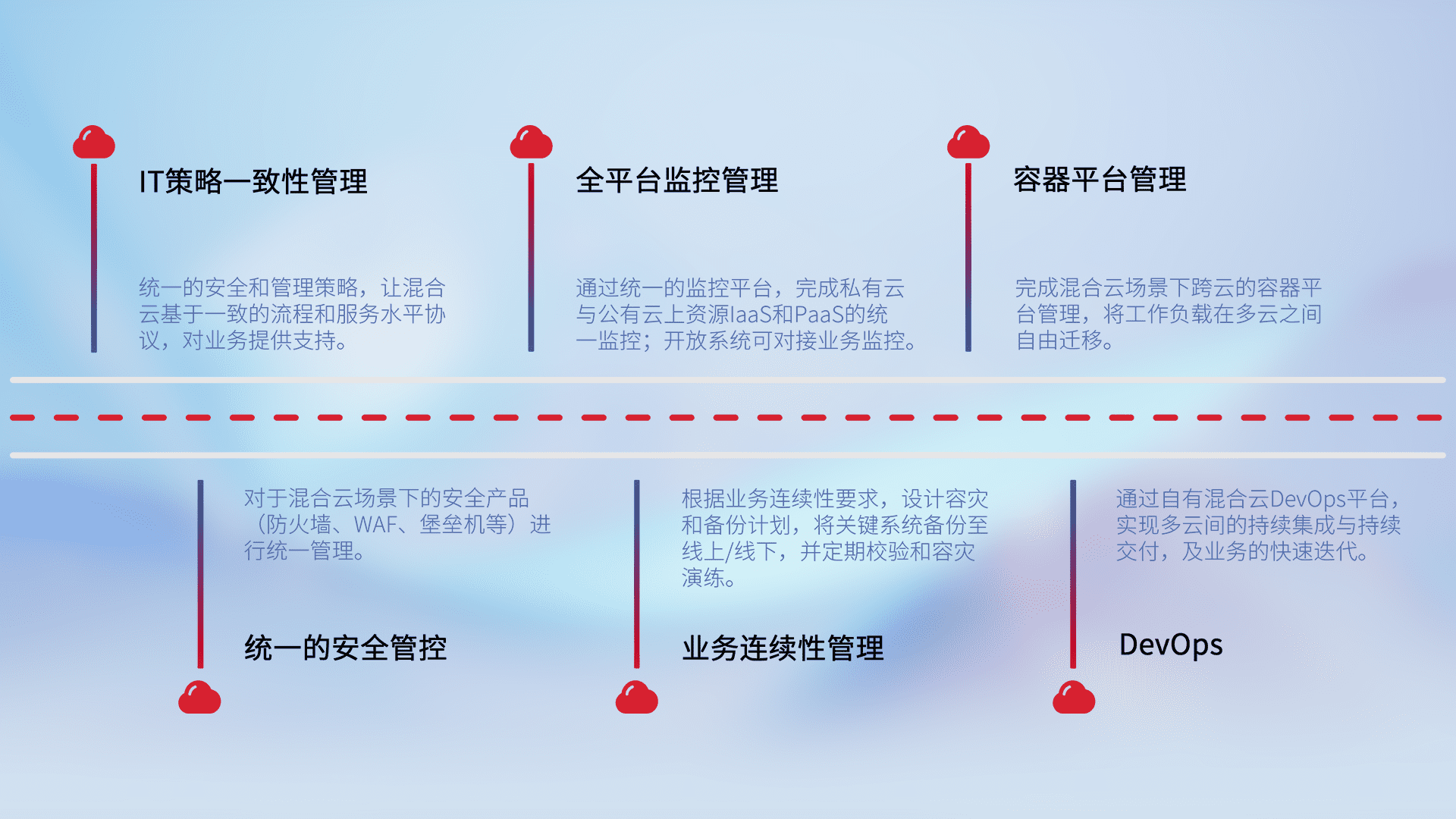 通过多云纳管,,以统一的资源数据模型把客户的云资源进行抽象和封装,,,,进而实现对多云资源的统一操作,,,保障云资源管理的可靠性、、、、稳定性与可用性。。。量身定制化运维内容,,配置、、、开发运维、、、补丁管理、、备份、、、、监控、、、认证和访问管理、、审计和日常巡检等,,保障在用云过程中的可靠度,,,,稳定度以及高可用率。。。。